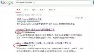 从“site”中我们可以看见百度只收录http,尽管做了301跳转;谷歌方面则收录了2个不同版本的页面,很明确的指明了我的主域名是哪个版本。另外收录情况也是大大不用。再看看它们在搜索结果里面的情况。
