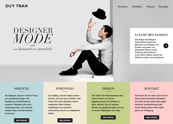 Duy Tran的网站中,每块柔和色区域实际上是个超大的按钮。这些柔和色告诉用户哪块是哪块,让每个都易于点击(或触摸)。这些色调很突出,因为与极简的主图区域形成鲜明对比。(轮播图中的每一张与这些柔和色调的按钮区别开)