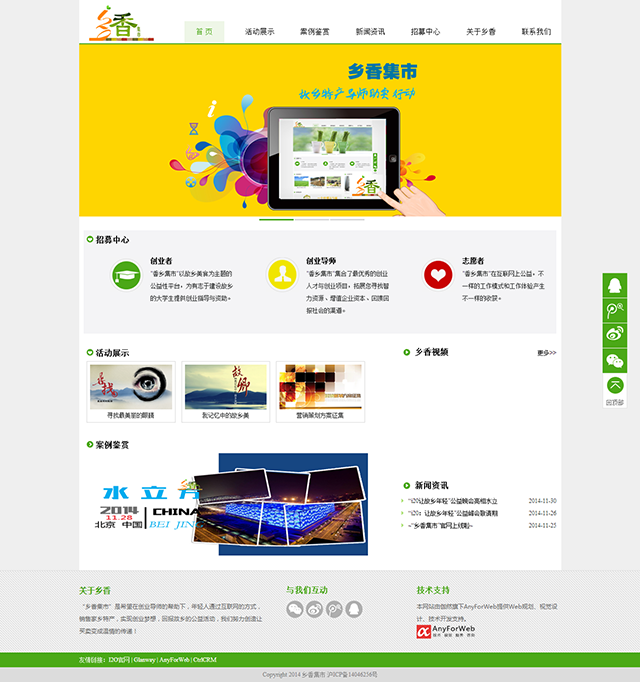 2.活动中的专题项目“乡香集市”特别定制了一个活动官方网站。该网站实现页面自适应,让用户在不同的设备上享受同样的视觉效果。在移动端越来越普及的时代中,这种设计能很大程度的提升用户体验,让用户从网站上直接感受到企业贴心的服务。